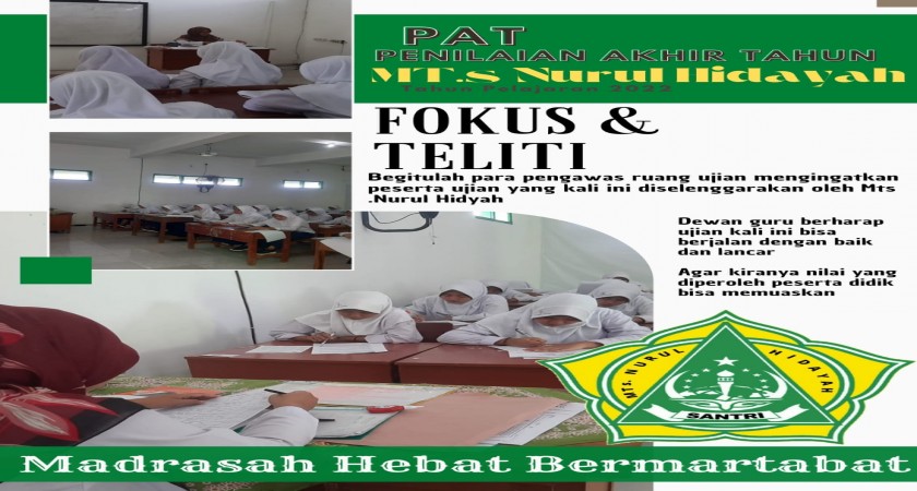 MTs NURUL HIDAYAH sedang melaksanakan PAT ( penilaian akhir semester ), yang pelaksanaannya di mulai tanggal 06 - 11 Juni 2022, yang diikuti oleh siswa kelas VII dan VIII yang berjumlah 186 siswa, dan terdiri 7 ruang.